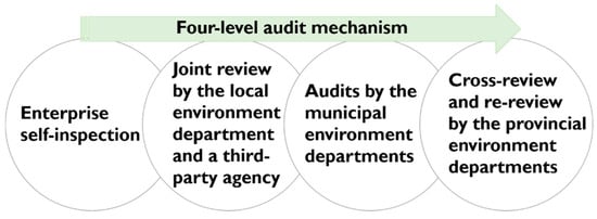 In 2012, the qualified dismantling enterprises first adopted daily reports for the information management of their operations. In 2016, the technology of the Internet of Things and video monitoring methods were comprehensively applied to achieve full coverage, no dead ends, and real-time dynamic monitoring of the production and operation process. Third-party professional organizations have been invited to conduct independent audits of the standardized management, key dismantling products, hazardous wastes of the qualified dismantling companies every quarter. Taking Sichuan as an example, a “four-level audit mechanism” has been established, that is, enterprise self-inspection, joint preliminary review by the local environment department and a third-party agency, audits by the municipal environment departments and cross-review and re-review by the provincial environment departments, as shown in Figure 2. At present, supervision of the qualified dismantling enterprises by governments at all levels has also shifted from the previous step-by-step management process strictly in accordance with the guidelines to the environmental risk management of hazardous waste and other emissions, which is specifically reflected in the newly revised “Guidelines for the Audit of the Dismantling and Treatment of Waste Electrical and Electronic Equipment” (2019 edition).