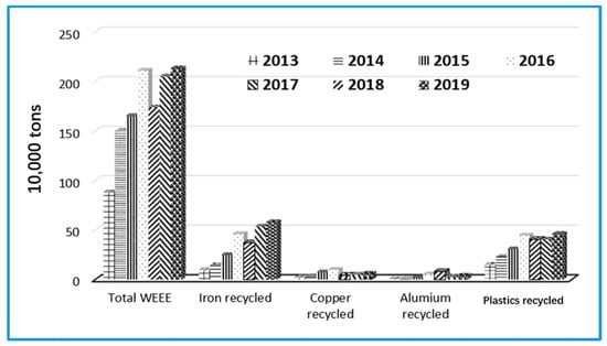From 2013 to 2019, a total of 12,060,000.04 tons of the key dismantling products were recycled by the 109 qualified WEEE dismantling enterprises, including 2,437,300 tons of synthetic pig iron, 375,400 tons of recycled copper, 229,400 tons of recycled aluminum and 2,404,300 tons of recycled plastics, as shown in Figure 3 [29,30]. Meanwhile, under the promotion of the “Implementation Plan on Improving the Recycling and Treatment System of Waste Home Appliances and Promoting the Renewal of Household Appliances Consumption”, the Chinese WEEE recycling industry is transforming from simple dismantling to fine and high-value automation (Figure 1).