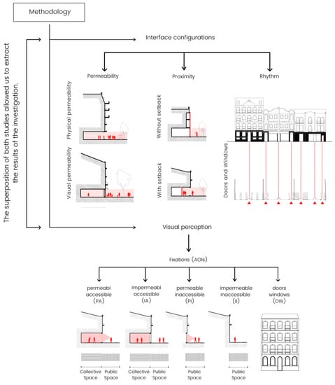 The current investigation determined each selected sample’s configurational properties and the pedestrians’ potential visual perception of it at the ground floor level. As a first and fundamental step, the street interface configurations were analyzed for the most common variables: permeability (visual/physical), proximity (distance/adjacent), and rhythm (doors/windows), while pedestrians’ visual preferences were analyzed using mobile eye-tracking glasses. The superposition of both studies allowed us to extract the results of the investigation.
