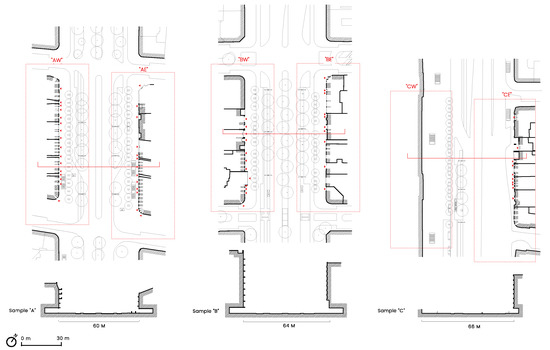 The eye-tracking results were then juxtaposed with drawings of the street interfaces’ morphological characteristics to provide a morphological interpretation of the relationship between street interfaces and visual perception that influences street livability. For each sample, the drawings were made according to the same graphic criteria and scales, using the classical architectural representation of spatial elements, including plans, cross-sections and façades, which can be compared and juxtaposed via visual perception analysis. The importance of studying the street interfaces related to the street segment and the context of the street itself explains the choice of multiple levels of resolution. These resolutions make it possible to study the street interfaces in relation to the street context.