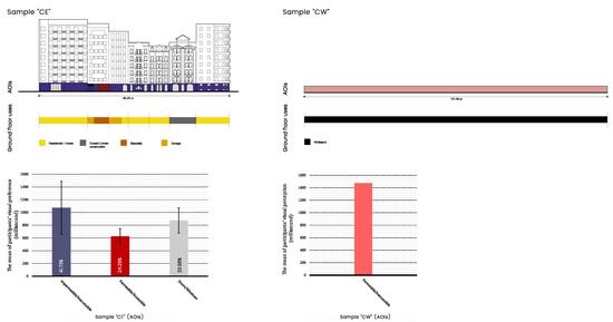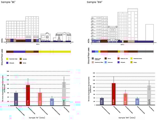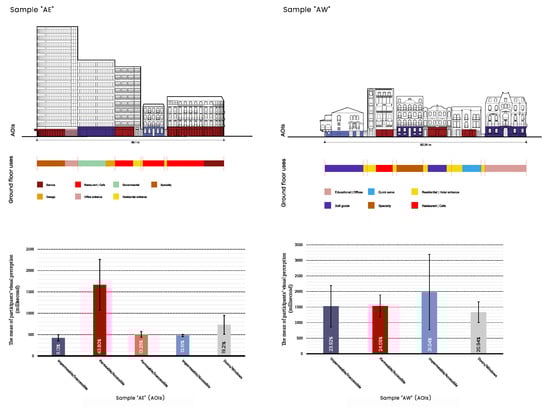 Participants’ visual preferences were also found to be related to the ground floor uses. The study shows that permeable and accessible interfaces, as in sample “AE”, “AW” and “BW”, constitute the commercial and social core. Restaurants and social activities were observed, linking permeability and accessibility, which attracted participants’ eyes immediately. Permeable and accessible interfaces promoted the connection between the ground floor and the street, whereby stores opened their doors to the public and demarcated the territory facing the street through elements such as advertisements, tables, and seats, which offered different sensory information and social stimuli, including the visual (
