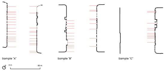 Figure 9). On average, participants were visually attracted to these 25.49% of the time, in comparison to the doors/windows (21.60%), permeable/inaccessible interfaces (19.15%), impermeable/accessible interfaces (17.73%), and impermeable/inaccessible interfaces (16.03%). The study highlights that participants were more visually attracted to the interfaces of sample “A”, occupying 43.63% of their time, compared to sample “B” (34.11%) and sample “C” (22.26%).