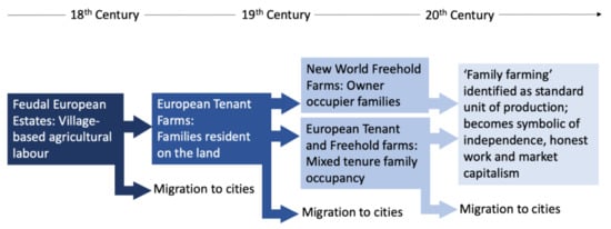 It is in this process that the term ‘family farm’ became enshrined in the hearts and minds of the North American agricultural community and to a lesser extent in Europe []. Thomas Jefferson in particular wrote about farming as the basic profession upon which all others depend. Farming was seen as an inherently moral activity, providing food, the basis for economic development and indeed democracy. The notion of full-time farming was particularly embraced, following a tenet that agriculture is “not an occupation so much as an all-encompassing lifestyle whose purpose was sustaining families and communities in addition to fields and pastures” [] (p. 209). Farming was understood as ‘natural’ and inherently moral, grounded in the virtue of hard work [].