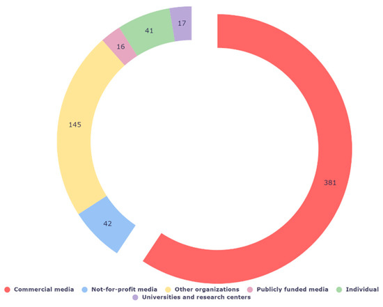 Regarding the profile of the companies that apply for funding, we can affirm that most of them are identified as “commercial media” (381). Universities and research centres (17) and publicly funded media (16) barely represent the 5% of the total of funded initiatives, followed by non-profit media (42) and individual participants (41). The latter have been counted as “independent actors” despite presenting or creating projects that involve or implicate existing media. Finally, in the category of “other organizations” (145) we have gathered different institutions that cannot be classified as media organizations, such as the Bulgarian company Damocles Analytics, which specializes in AI-driven political insights. The French private meteorological consultancy Meteo Consult also belongs to this category, as well as the German micropayment solution PayPeanuts or the Polish E-Kiosk. Figure 1 shows the different kinds of companies that have been funded by the DNI.