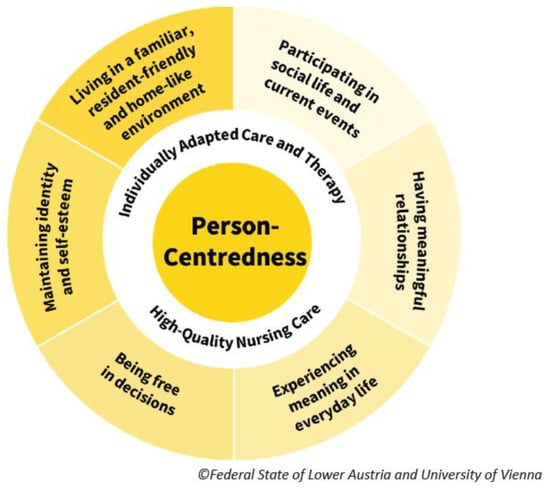 To include all aspects of comfort, it is therefore essential and necessary to focus on the so-called person-centred care accordingly. Person-centred care aims at meeting the needs and wishes of residents in nursing homes. It focuses on the emotional and social aspects of care, and the emphasis is on relationships. Individualised approaches support opportunities for social engagement and help people live their lives and experience wellbeing. An understanding of the perspective of the person and respect and value for the individual as a full member of society guarantee appreciation and acceptance [19,20]. McCormack [21], as one of the leading researchers in this field, argued that four core “modes of being” are the heart of person-centredness: being in relation, being in a social world, being in place, and being with self.
