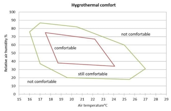 The hygrothermal indoor climate is, in essence, described by the parameters of air temperature and humidity. These two parameters were therefore measured and evaluated in a further step. The analysis of hygrothermal comfort was performed using the Frank comfort diagram. The “comfortable”, “still comfortable”, and “not comfortable” ranges of the temperature and the humidity are shown in Figure 2.