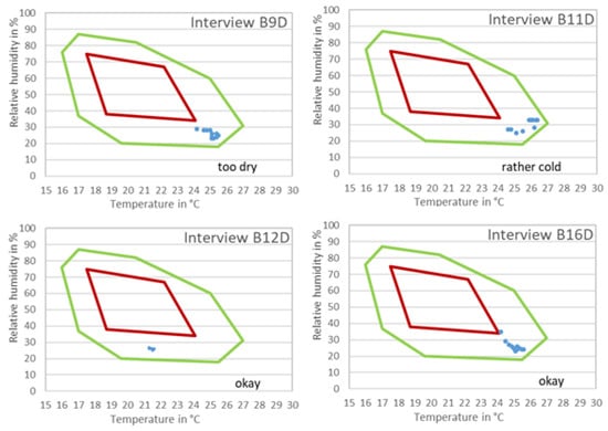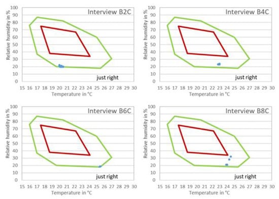 Compared to the nursing home in Wolkersdorf, where all interviewees answered that they were satisfied with the climate, the interviewees from the nursing home in St. Pölten had different opinions from each other. Even though it can be seen in Figure 4 that all the blue dots are in the “still comfortable” range, the temperature here was between 21.3 and 25.5 °C, and the relative humidity was between 23% and 35%. In addition, in this case, the humidity was below the 45% recommended by ASHRAE [42], but only one interview participant, (B9D), said the air was “too dry”. One can very well see the subjectivity of each person in the case of interview B11D, who stated that the temperature was “rather cold” even though, compared with the temperature measured in the other interviews, during which the interviewees had answered that the temperature was satisfying, it was higher.