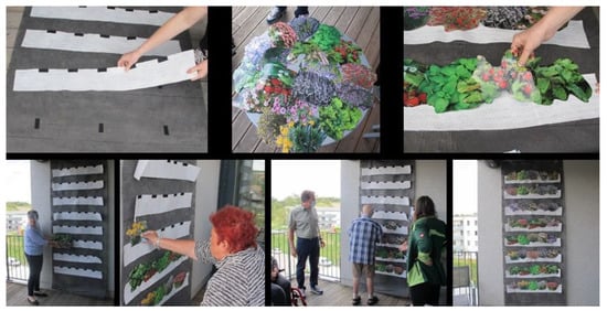 Two consecutive co-creative workshops were planned and conducted. At first, the team presented a broad input and information about greening solutions (indoors and outdoors) and different plants to lay the foundation for the co-creation process. After jointly deciding on implementing vertical green walls outdoors on the balconies of the nursing home, different plants were introduced, pictures shown, and visual descriptions and actual plant samples used to stimulate all the senses in terms of aesthetics, scents, and textures of the plants. This step was combined with discussing and taking up biographies of the elderly and their experiences and feelings towards plants. It was then established which plants were most favourited by the residents, and specific plants for the green wall were chosen. This led to a follow-up workshop inspired by the method of action research (Figure 5). A model of the vertical green wall was provided, and workshop participants were invited to paste pictures of the chosen plants hands-on in their preferred arrangement and order, considering colours, necessities, scents, aesthetics, etc. According to the residents’ choice and arrangement of the plants, the vertical green wall was then built. Resident-adapted vertical green walls on balconies of the elderly centre in Wolkersdorf were developed. The green walls have easily manageable water connections. Materials, dimensions, and planting plans were co-created together with the residents as future users, with the project team’s expertise ensuring a functioning green wall.
