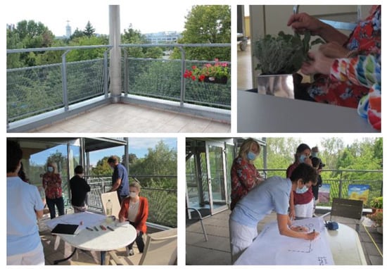The co-creative workshops in the nursing home of Wolkersdorf were conducted with the residents of the elderly centre, which means that residents were significantly involved in the planning process and could introduce their ideas, wishes, and needs, which were then taken up by the designing and implementing/construction team. Impressions of these workshops can be seen in Figure 5.