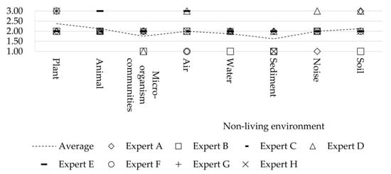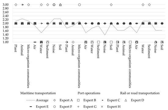 With the local ecosystem and international shipping conditions in mind, the experts provide their opinions on the ecological impacts of international shipping by scoring the I, C, R of the MDDM model and by calculating them using Equation (1) and Equation (2). Figure 3 presents the results where opinions from experts () are indicated by different kinds of scattered geometric shapes while final views () are connected by a dotted line. It is, however, not visible that most of the experts scored the impacts ranging from −3 to 0, with the average scores being on a scale of −0.05 to −4.65. Through expert consultation, the factors that are scored, on average, less than −2.00 should be given special consideration in respect to the avoidance of negative impacts. As a result, it can be found that maritime transportation has a noticeable negative influence on animals; port operations affect water and noise negatively; and rail or road transportation causes significant negative effects on noise, air, and plants. The local ecosystems, in contrast, are influenced more by land transportation.