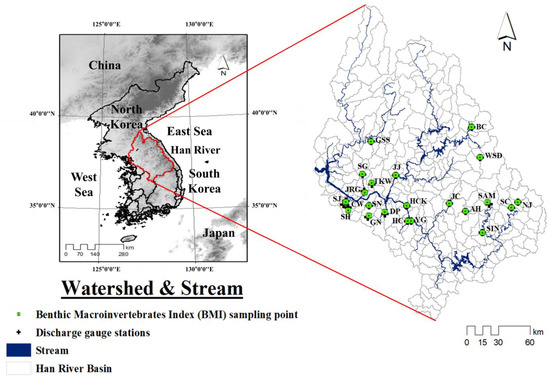 Kim, S.; Lee, J.; Jeon, S.; Lee, M.; An, H.; Jung, K.; Kim, S.; Park, D. Correlation Analysis between Hydrologic Flow Metrics and Benthic Macroinvertebrates Index (BMI) in the Han River Basin, South Korea. Sustainability 2021, 13, 11477. https://doi.org/10.3390/su132011477