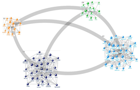 Internet searches with the keyword “dining-out” produced 39,144 results for 2019 data and 39,240 results for 2020 data on the abovementioned portal sites’ blogs and cafes (See Table 1). Narrative coding was done for text-mining indicators on dining-out and clustered into food, sentimental, demand/purpose, and tourism/region (Table 2). The most important keyword, food, was placed in the center and combined with sentimental, and demand/purpose, which represented the purpose and meaning of the search for network analysis and visualization.