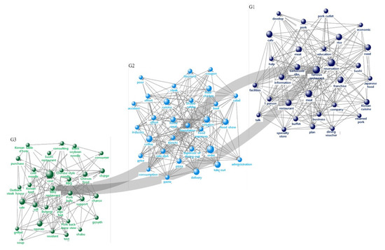 Frequency analysis was performed for keywords extracted from dining-related documents in 2020. The most frequently appearing word was “dining-out,” as in 2020 (Table 4), followed by family, famous restaurant, recommend, taste, Corona, weekend, dinner, restaurant, and menu. A high TF-IDF value was observed for words such as home meal, delivery, hotel, restaurant management, and cooking, indicating that these words had a high scarcity value in dining-related documents generated in 2020 amid the COVID-19 pandemic. Compared to the pre-pandemic period, keywords such as home meal, delivery, and cooking became very influential for dining-related data in 2020.