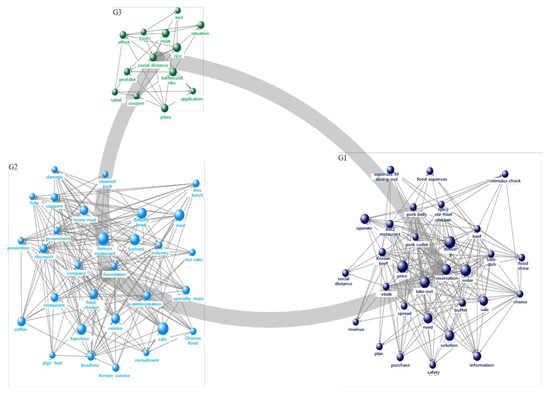 The results of the semantic network analysis on the relationship between dining-out and consumer demand (purpose) for 2020 data are depicted in Table 8. Discourses were formed revolving around keywords such as price, delivery, order, take-out, famous restaurant, café, meal, rice, meat, barbecued ribs, pizza, and social distance. Unlike in 2019, the foremost purpose of the search for dining-out was to obtain information on food delivery, order, and take-out, indicating that consumers’ dining-out demand shifted toward this amid the COVID-19 pandemic. The same result was observed in the demand network visualization, as three categories were identified: delivery, famous restaurants, and social distance (Figure 4). That is, consumers searched “dining-out” on portal sites for information on food take-out, order, and delivery to meet their demand for dining-out experience in compliance with social distance, thereby generating strikingly different results from the 2019 data.