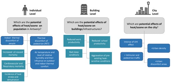 As a first step, the Belgian Federal Heat Plan (2016) was reviewed to identify the main impacts caused by heatwaves in Antwerp. These range from dermatitis or edema of the extremities to insolation, exhaustion, and heat stroke. Research studies were also analyzed to identify the potential impacts of heatwaves on the productivity of workers or students, which range from loss of concentration to muscle cramps.
