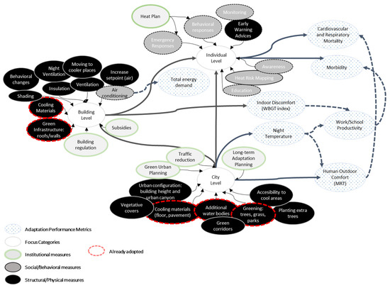 - Existing system—planting extra trees (10%)—additional water bodies—cool roof—cool pavement—traffic reduction—pedestrianize—planting extra trees (25%)—greening (20%)—accessibility to cool areas;