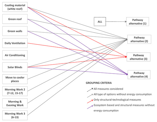 The first adaptation pathway alternative considers all the adaptation options that aims for the maximum effectiveness capacity of the selected options. The second considers all of them except those that imply energy consumption (such as ventilation and air conditioning), and aims to align the mitigation and adaptation objectives. The third adaptation pathway considers only structural–technological options that allow depicting the hard options. The last pathway considers structural options (both ecosystem-based and technological-based ones), but without energy consumption.