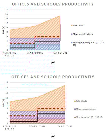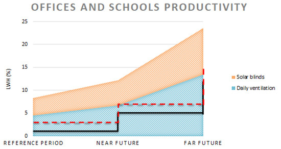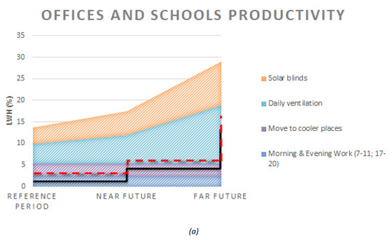 A tipping point occurs in the near future when these soft options are not enough and structural–technological options, such as solar blinds or ventilation, will need to be implemented to avoid exceeding the LWH threshold of 6% in the near future. The worst-case scenario will occur in the far future, when it will be necessary to implement structural options, such as green roofs, green walls, and cooling materials outside the building to protect the indoor temperature of the building. Notably, the effectiveness of these structural options of greening and including cool material was determined considering outside maximum temperature; we did not assess their the effect on lost working hours. As these adaptation options are planned to be implemented in the near and far future, the city has time to conduct additional research and assess the reduction in lost working hours provided by these options.