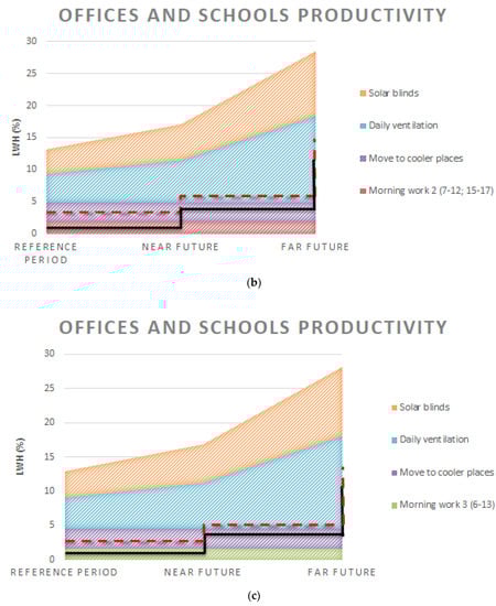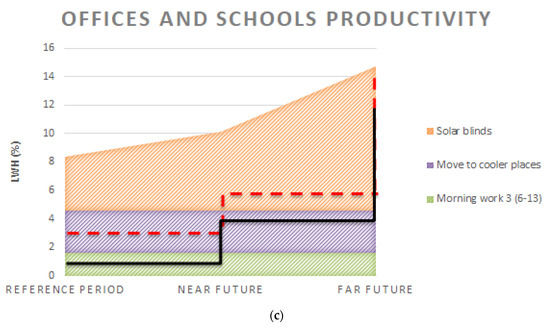 Pathway alternative 1 for work productivity: (a) considering the morning and evening working scheme (7:00–11:00 and 17:00–20:00); (b) considering a working scheme of 7:00–12:00 and 15:00–17:00; and (c) considering only a morning working scheme (6:00–13:00). The dashed red line indicates the worst-case scenario threshold and the black line indicates the medium-case scenario threshold.