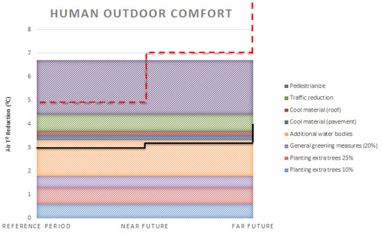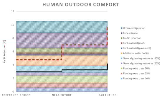 In the city-level adaptation pathways, there is a need to implement many adaptation options to keep the current thermal comfort levels below the acceptable threshold (e.g., planting extra trees, additional water bodies, cooling materials, pedestrianizing, traffic reduction, amongst others). Therefore, the use of ecosystem-based or technological options (e.g., green infrastructure and cooling materials) is not enough, and additional options, such as institutional options (e.g., traffic reduction) and grey solutions (urban configuration), will be needed. However, a tipping point occurs in the near future when the initial options will not be enough, and more effort will be required (such as increasing the greening percentage) to reduce the minimum temperature of 7 °C in the near future. The most difficult challenge will occur in the far future, when it will be necessary to include all the identified options to reduce the minimum temperature of 10 °C.