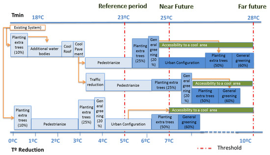 Pathway 3 is effective in the reference period and the near future. For the far future, the city needs to include additional adaptation options in order to keep human comfort below the acceptable thresholds. In addition, Figure 14 shows the adaptation pathway alternatives at the city level on a temporal scale. All the adaptation alternatives considered are included and different pathways are illustrated.