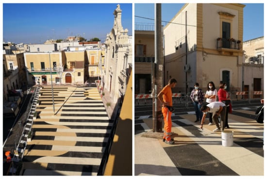 On 4 May 2020, the first “hard” lockdown in Italy ended and cities worldwide took advantage of this pause to reorient their urban agendas towards the resumption of daily activities. On 26 May, the City of Bari launched “Open Space”, a “Program on sustainable mobility and public space for the implementation of distancing measures related to the COVID-19 emergency” [49]. The program is intended to reorient sustainability objectives and, more generally, to test the idea of a city based on resilient communities, by adjusting or accelerating some ongoing processes: fostering sustainable mobility; increasing the allocation of open public space; enhancing greenery and proximity services. The main objectives of the program are oriented towards well-being and public health and social and economic revitalization. The interventions on the urban space made use of tools belonging to tactical urbanism domain, with quick, economic, flexible interventions that are, above all, participated with local communities. Open Space contributes to two main spheres: “A Muoversi” and “A Stare” [50].