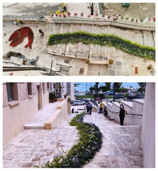 With respect to this state of the art, a new municipal administration has tried to rethink the development model of the city, heterodirected by the national state for over a century (first with the most important headquarters of the National Navy, then with the largest steel plant of Europe), pursuing self-sustainability, differentiation, and multiplicity of urban economies [53]. In this strategy, called the Taranto Ecosystem, the role of the public space assumes a fundamental role because it becomes the space for the representation of this desire for change of the established community. The urban regeneration of large suburban districts has been planned, but at the same time small interventions to test different relationship between citizens and common space in a city and in a community that has probably lost the habit of considering the collective space as a property of all of us, on the contrary normally identified with the space of the national state as if it were an external subject and far from the community itself. Starting from these general considerations, in coherence with the concepts expressed in the initial paragraphs, here we present two ways of understanding public space and its relationship with the community. The first transforms the open and public spaces of the historic center into places appropriated by the inhabitants with some specialized operators to guide paths and create parking places, through the use of flowers (Figure 4). It is a temporary use that lasts only three days, but which helps to change the gaze on these spaces where sometimes cars or engines still circulate, but which due to the materials they are made of and the intimate relationship they have with homes and social functions that often host, in these three days they become a plant link between public and private uses and functions.