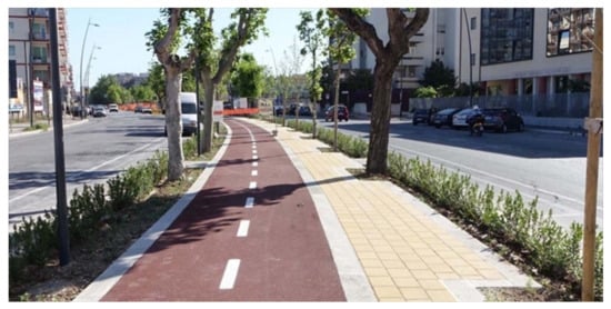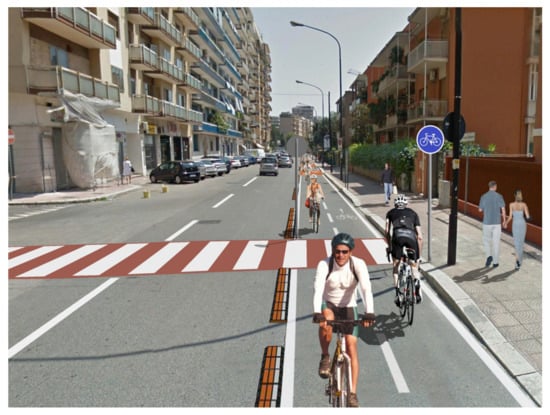 In this case, through the inclusion of cycle paths and pedestrian paths (Figure 5 and Figure 6), even if only drawn on the asphalt road, it transforms a space mainly or exclusively dedicated to cars into a public area where citizens and users move in a new way and acquire mastery of it.