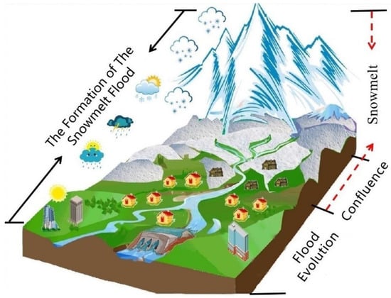 Floods are some of the most frequent and severe natural disasters in the world []. Since the 20th century, river floods have caused approximately 7 million deaths and direct annual losses of 10.4 billion U.S. dollars []. About two-thirds of the area in China faces the threat of floods []. Snowmelt floods often take place in northwestern China, which causes damages to road traffic, downstream reservoirs, channels, and other engineering facilities, and threatens the safety of people’s lives and properties. In the context of global warming, the speed of ice and snow melting has accelerated, causing advanced ablation periods and earlier snowmelt flooding peaks []. In addition, due to increasing rain-on-snow (ROS) events, the frequency and intensity of rain and snow mixed floods have increased significantly, and the losses caused by flood disasters are increasing accordingly [].