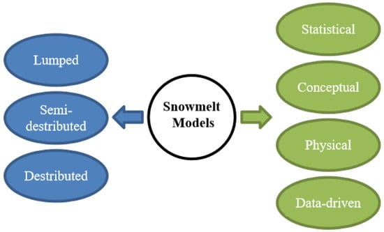 Categories of snowmelt models. Blue categories are derived according to the spatial distribution characteristics of the models. Green ones are derived according to different ablation algorithms.