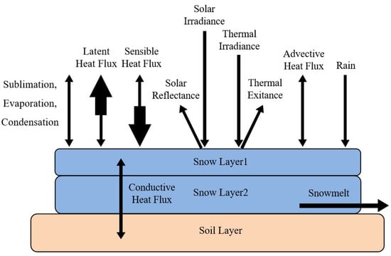 The internal process of the snow can be better estimated by dividing it into many layers when the snow is thick enough. Anderson [] uses a finite difference to calculate a multi-layer snow model, which considers fresh snow, compaction, change and retention, and liquid water transmission across different layers. Jordan [] developed a one-dimensional numerical layered snow thermal model (SNTHERM.89), which divides the snow into multiple horizontal layers with each layer being controlled by the energy and mass balance equations. It can better simulate the features on the snow profile, such as snow depth, snow density, snow temperature, etc. Marks [] took into account the temperature difference between the snow surface and snow layer, and proposed a two-layer energy balance snow melting model (SNOBAL). The critical freezing depth was calculated by the temperature gradient between the melting layer and the non-melting layer. The snow model in the Precipitation-Runoff Modeling System (PRMS) [] is also a two-layer energy balance model. Bartelt et al. [] developed a one-dimensional physical snow pack model (SNOWPACK). In this model, snow layers are defined by their size as well as their macroscopic properties (i.e., bulk density, mean stress, water content or temperature) and microscopic properties (i.e., ice grain size and shape, bond size or coordination number). This model can predict snow settlement, stratification, surface energy exchange and mass balance, and can be used to predict the occurrence of avalanches.