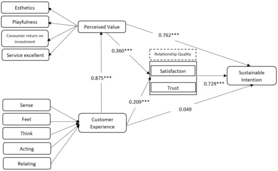 Furthermore, based on several previous studies, the management of digital content in s-commerce that refers to the PV and CE variables can create customer relationship quality, and this can also affect customer perceptions. In the field of marketing science, the quality of the relationship between customers and providers is the main goal that must be achieved properly [87]; if these efforts are fulfilled it will have an impact on minimizing the marketing budget [129]. This study confirms that the concept of customer relationship quality can significantly provide added value in building good relationships between customers and providers. This is in line with hypotheses 3-5 that we proposed earlier. The impact of a good customer relationship will result in sustainable customer intention in s-commerce. Furthermore, digitalization causes social media to have a major role in the distribution of information, especially regarding the value of a product. So, it must be considered in detail the quality of digital content in marketing on s-commerce, to have optimal and targeted performance for the sustainability of product and company values. Another aspect that must be considered in s-commerce is the value of a product and brand image, both of which must have the right correlation with performance and good marketing so that the experience felt by the customer is positive [130,131,132,133]. On the other hand, from the indirect correlation aspect, customer relationship quality has the power to encourage engagement between customers and providers in strengthening the value of a brand. Benefits that can be felt when customer relationship quality increases is a favorable customer relationship and by itself will increase loyalty to the products offered.