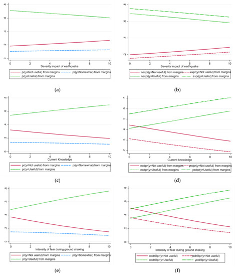 Figure 1 shows the predicted probabilities of the continuous variables and the outcome categories (it should be highlighted that the predicted probabilities are within the range of the observed values, i.e., by considering the original scale of these variables, i.e., from 0–10, see Table 1). For example, Figure 1a,b shows the probability of the SASMEX system being ‘Useful’ is around 71% for individuals that consider insignificant the impact of earthquakes; however, for those that consider a severe impact of these events, the probability is around 61% (i.e., the probability of the SASMEX being ‘Useful’ decreases as the severity of harm increases). Conversely, the probability of the system being ‘Not useful’ increases from 19% at around 24% for those that considered a severe impact of earthquakes (see Section 3.2).