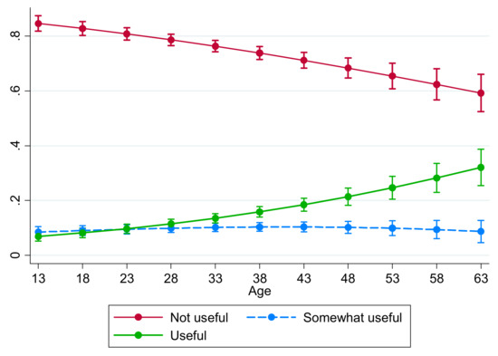 Regarding the variables that violated the parallel-lines assumptions, the results revealed that older participants were associated with the likelihood of being in a higher level of the outcome variable (‘Usefulness of the SASMEX’). The effects became much stronger when the outcome variable moved from ‘Not useful’ to ‘Useful’ (Figure 2). Further, the figure shows the probability of the SASMEX system being ‘Not useful’ is around 82% for 13-year-old participants and it decreases as the age increases (see Section 4.3 for more on this).