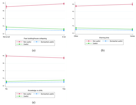 Drills are part of the continuous process of emergency preparedness [51,52]. Mass earthquake drills are conducted yearly in the capital city and aided by the SASMEX system, and the participants of the study consider this as a positive thing to do [40]. Negative affect (fear) plays a crucial role in the process of decision-making during an earthquake emergency. For example, in [53] it has been reported that individuals experiencing fear “might be receptive to information to engage in a danger control mechanism”, and that may be the case of the earthquake alert system. The results also have highlighted that the probability of the SASMEX being ‘Useful’ increases with the intensity of fear experienced by the participants during the ground shaking (Figure 1e,f). Moreover, those subjects that participated in earthquake drills were less likely to see the system ‘Not useful’. Again, the finding is consistent with those reported on mass earthquake drills where participants agree on participating in several drills per year [54].