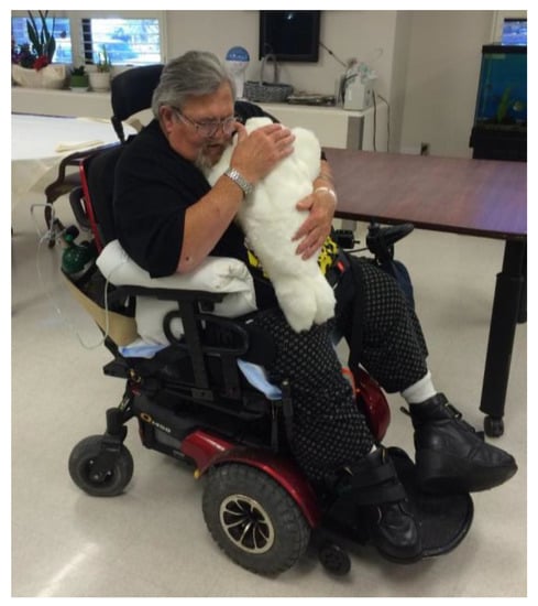 - Moyle, W.; Jones, C.; Murfield, J.; Thalib, L.; Beattie, E.R.; Shum, D.H.K.; O’Dwyer, S.; Mervin, M.C.; Draper, B.M. Use of a Robotic Seal as a Therapeutic Tool to Improve Dementia Symptoms: A Cluster-Randomized Controlled Trial. J. Am. Med. Dir. Assoc. 2017, 18, 766–773. [Google Scholar] [CrossRef] [Green Version]