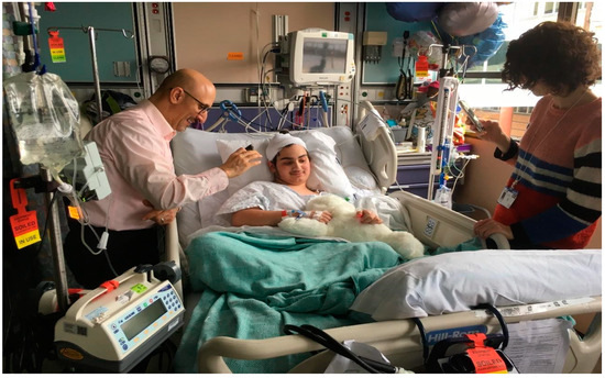 PARO in a pediatric intensive care unit (P-ICU) under strict IPC restrictions. The 11-year-old boy has a brain tumor and has undergone more than 120 surgical operations in less than 10 years. Interacting with PARO helped improve his mood and reduced his anxiety, pain, and depression. His family was delighted to see his improvement (picture taken at the Children’s Hospital of UC San Francisco in April 2019, before the COVID-19 pandemic).