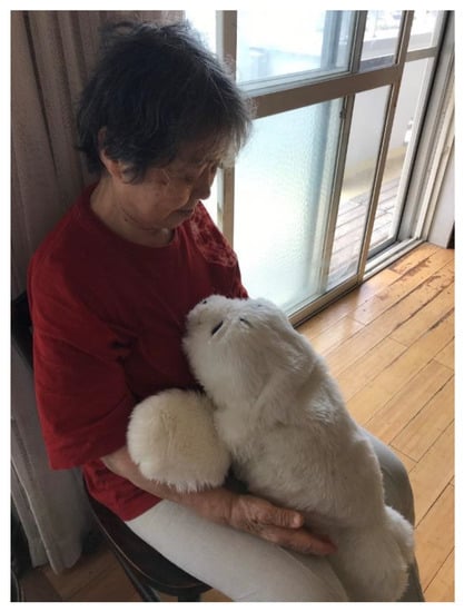 In early July 2020, we were given the grave news of the death of the father. He had suddenly passed away at the beginning of January 2020. The mother is well and continues her interactions with PARO (Figure 4). The pandemic has prevented her from outdoor activities, but due to her dementia, she could not fully understand the situation and seemed as happy as always, especially when with PARO. Due to the pandemic, the daughter’s burden of care increased, as home care workers could not visit to help, but she felt very much emotionally helped by having PARO by her side to interact with her mother, keeping her calm and happy. Even through COVID-19 isolation, the daughter-mother duo was able to maintain positive emotional health by living with PARO, as the behavioral issues of the mother were minimized and the burden of care on the daughter substantially reduced.
