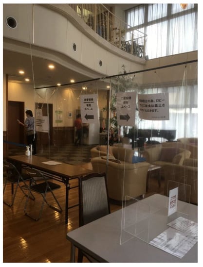 Due to the pandemic, family visits to nursing homes are limited in time and number. The entrance hall is secluded and managed by appointment (picture taken in Japan in July 2020, during the COVID-19 pandemic).