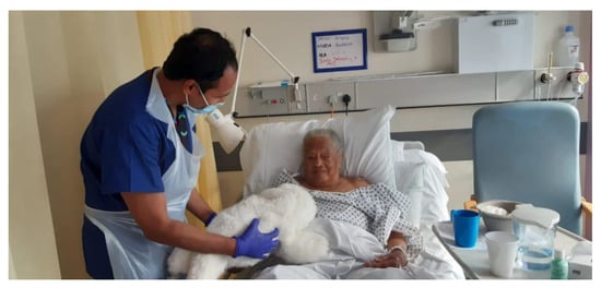 Since then, PARO has been reintroduced for use with select patients under the hospital infection control policy (Figure 7). The cleaning protocol of PARO has remained the same before and after COVID-19. Under the Public Health England (PHE) Guidance COVID-19, all staff on the wards are required to wear appropriate PPE (aprons, masks, and gloves) at all times.