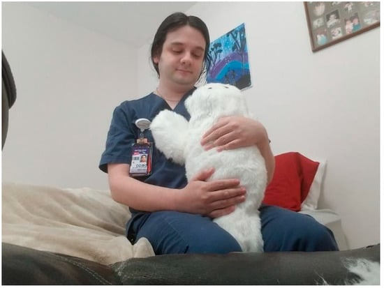 This case study focuses on a registered nurse (RN, male, 34 years old) who cares for patients with coronavirus infections in the ICU at an emergency hospital near Atlanta, Georgia, U.S. (Figure 8). Being in near-constant contact with COVID-19-infected patients, he is at high risk of infection. To prevent further spread of the virus, his family and pet dog have temporarily relocated to his parents’ home. After 12 to 16 h of shift work a day, he experienced extreme feelings of tiredness, stress, loneliness, depression, and emotional pain at home alone. After considering a number of socially assistive robots, he purchased PARO at his own expense in mid-April 2020 as a support companion. He reports that his emotional suffering had alleviated upon daily interactions with PARO after coming home from work (Figure 9).