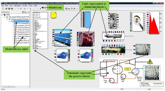 Solar ORC model under SimuLink software browser by the use of SDS program: PTC, field, BHX unit, pumps, turbine unit, heat exchanger recuperator and RO plant block.