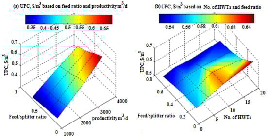 (a) Effect of feed splitter ratio and RO-PEX productivity on the UPC, USD/m3; (b) effect of feed/splitter ratio and no. of HWTs on the UPC, USD/m3.