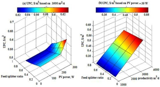 (a) UPC, USD/m3 vs. PV power, W and RO–PEX feed splitter ratio, (b) UPC, USD/m3 vs. productivity, m3/day and RO–PEX feed splitter ratio (PV solar field without HWT farm).