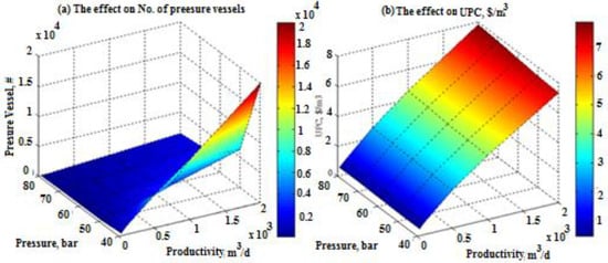 Effect of HPP pressure and system productivity on (a) No. of pressure vessels, and (b) UPC in USD/m3.