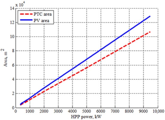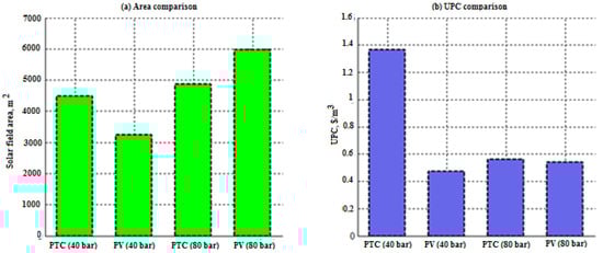 The PV-RO is compared with the S-ORC-RO system under the same operating conditions based on the 3500 m3/day capacity. For HPPRO = 40 bar category, the solar thermal cycle (PTC) consumed a larger area (4475 vs. 3243 m2) and a larger UPC (1.365 vs. 0.4705 USD/m3). Increasing the number of pressure vessels increased the indirect costs for both systems. Moreover, the power load on the thermal units was synchronized with more thermal units, mass flow rates and pumps comparing with direct contact in the case of PV-RO. Even though the HPPRO = 80 bar category harvested more area, the UPC was lower for thermal system; however, it increased a little in the electric one. The HPPRO = 80 bar category required more power, i.e., more area was needed. Figure 7 shows the data comparison between both systems according to the area and UPC at 3500 m3/day. Increasing the pressure on the RO reduced the number of pressure vessels (26 at 80 bar vs. 450 at 40 bar). Therefore, the power increase to harvest more solar area caused an increase in the UPC. Figure 8 shows variations in the solar field area for both sites (thermal and electrical) according to the variations of HPP power. Increasing the power demand by the RO pump required more area to cover the load. The competition of PV with solar thermal for power generation is still far away from implementation because of limitations to the PV operation. Table 6 illustrates the comparison between the PV and the CSP thermal power.
