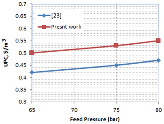 Figure 9 shows the UPC comparison between Toh et al. [23] and the present work with different feed pressures. Increasing the pressure on the RO caused an increase in the UPC, and the results showed compatibility and convergence.