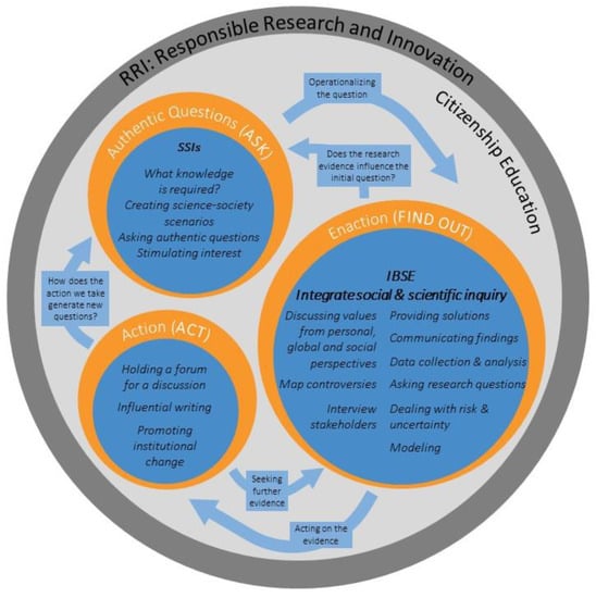 SSIBL [18,19] conforms broadly to a pluralistic approach in that it is inquiry-driven and identifies problems that need solving, drawing on transdisciplinary methods in seeking solutions to a variety of common problems associated with the uncertainties of a post-normal world [20], i.e., one such as in the present COVID-19 pandemic where facts are uncertain; values are in dispute, such as the push or resistance to the global distribution of vaccines; stakes are high in literal terms of life and death; and decisions are urgent, for example the need to trial vaccines before standard regulatory periods. Figure 1 demonstrates the approach behind SSIBL [19]. SSIBL was formulated through an EU project, ‘Promoting Attainment of Responsible Research and Innovation in Science Education’ (PARRISE), to bring to the fore transnational ideas, best instructional practices and resources relating to learning about responsible innovation [21]. SSIBL links the following three pedagogical approaches: (a) Inquiry-Based Science Education (IBSE), which takes inquiry as its starting point where knowledge can both be used and constructed; (b) Socio-Scientific Issues (SSI) in which inquiry takes place through examining social issues with a strong scientific content such as sustainability; and (c) Citizenship Education (CE), which focuses on participatory learning and inquiry, with objectives consistent with democratic practices. These ideas can be encompassed through inquiries that are directed towards sustainable, socially desirable and ethically acceptable outcomes [22].