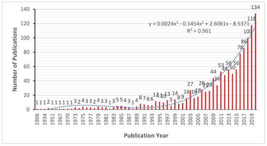 Although there were few discrepancies in the number of yearly publications reported, a gradual increase in yearly publications was observed during the studied period (Figure 1). Moreover, the positive correlation (y = 0.0024 × 3 − 0.1454 × 2 + 2.6061× −8.5371; R2 = 0.961) obtained when the data were fitted into a polynomial model indicates that more data or publications on this subject could be generated in years to come. It was also observed that scholarly works on road dust have been conducted in the domains of surveillance [29], source apportionment [64], distribution [65,66], and ecological toxicity [19]. The annual growth rate of 8.97% for published literature within this timeframe further confirms that research on heavy metal pollution in road dust has attracted attention over the years.