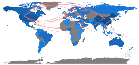 Figure 2 depicts research collaborations on road dust research among the top 20 countries. Lines are routes that connect these countries and are employed for knowledge map visualization [83]. The line connections represent the number of collaborations among countries and the line thickness indicates the strength/frequency of the collaboration. It is evident from Figure 2 that China and the United Kingdom were the countries with the highest collaboration on the subject with 21 connection lines each to other countries. China’s strongest connection was with the USA, Canada, Germany, and Australia. The USA (with 20 connection lines) had the third highest collaborative strength. The collaborative advantage of China over other countries of the world other than the United Kingdom may be related to the setting up of different funding and travel schemes/programs by the Government of China for Chinese scientists. Examples of these schemes/programs are the “Framework Program” and “Thousand Talent Program, Horizon 2020”; these are programs financed by both China and the European Union (https://www.enago.com/academy/chinese-scientists-increase-global-research-collaboration/, accessed on 13 October 2021).